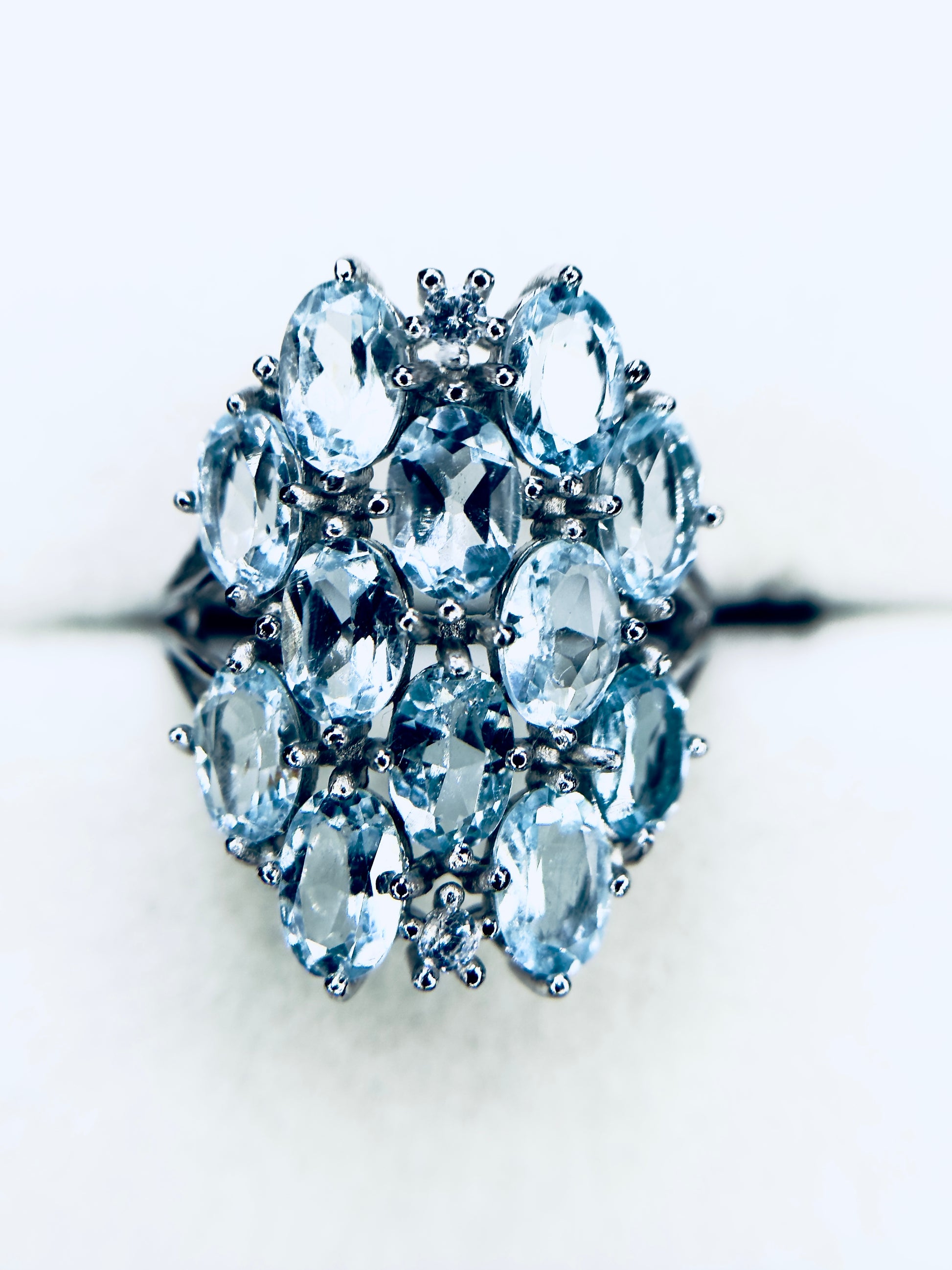 This breathtaking ring features 12 sparkling aquamarine stones, set in genuine .925 sterling silver. Adjustable for the perfect fit, it’s a statement piece full of calming aquamarine energy and timeless elegance